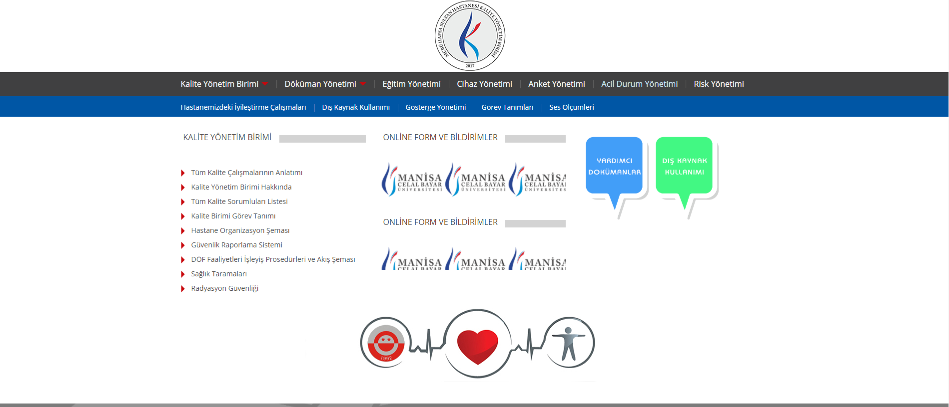 9. KALITE YÖNETIM BIRIMI ÇALIŞMALARI, DOKÜMAN YÖNETIMI, CIHAZ YÖNETIMI, ANKET YÖNETIMI, ACIL DURUM YÖNETIMI, RISK YÖNETIMI GIBI… KONULARIN ILGILI PERSONEL VE BIRIMLERLE PAYLAŞIMININ SAĞLANMASI AMACIYLA HKYB.CBU.EDU.TR SADECE KURUM IÇINDE ULAŞILABILECEK DIŞ ORTAMA KAPALI INTRANET SISTEMI HAZIRLANARAK KULLANIMA SUNULMUŞTUR. 2018 YILI IÇERISINDE KULLANIMININ YAYGINLAŞTIRILMASI PLANLANMAKTADIR.