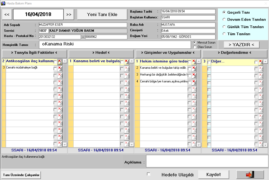 13. HASTALARIMIZIN ILK YATIŞLARINDA YUKARIDA BELIRTILEN RISKLERDE GÖZ ÖNÜNDE BULUNDURULARAK HEMŞIRELIK BAKIM PLANI MEVZUATA UYGUN ŞEKILDE HAZIRLANMAKTA, BU PLANA YÖNELIK HEDEFLER, GIRIŞIMLER VE UYGULAMALAR VE DEĞERLENDIRME KAYITLARI TUTULARAK HEMŞIRELERIMIZIN TEDAVI SÜRECINE KATILIMININ ETKINLIĞI ARTTIRILMAKTADIR.