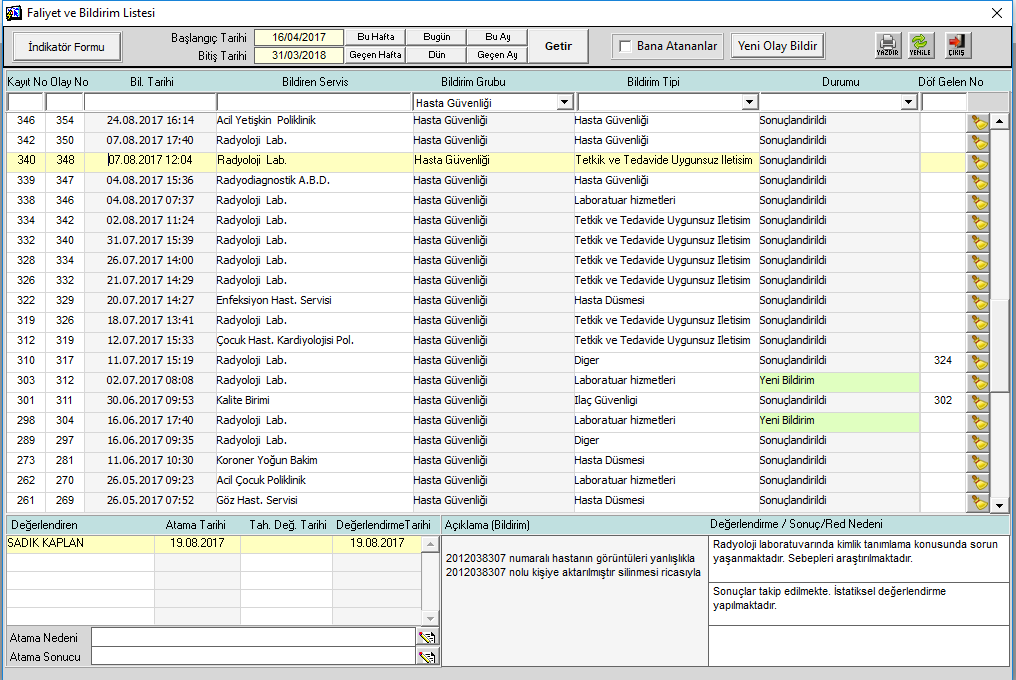 4. HASTA GÜVENLIĞI, ÇALIŞAN GÜVENLIĞI, İLAÇ HATALARI, LABORATUVAR HATALARI, CERRAHI HATALARA YÖNELIK RAMAK KALA VE GERÇEKLEŞEN OLAYLARIN BILDIRILEBILECEĞI, GÜVENLIK RAPORLAMA SISTEMI KURGULANARAK INTRANET ORTAMINDA DÜZENLENMESI SAĞLANDI. 2017 YILINDA 550 BILDIRIM YAPILMIŞTIR. BU ALANA YAPILAN BILDIRIMLER ANALIZ EDILEREK ILGILI KOMITE VE EKIPLERDE GÖRÜŞÜLMÜŞ VE ÜST YÖNETIME ANALIZ SONUÇLARINA ILIŞKIN BILGILENDIRME YAPILMIŞTIR.