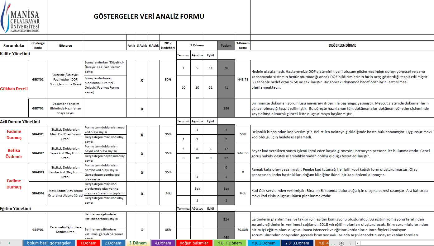 8. SAĞLIK BAKANLIĞI KURUMSAL KALITE SISTEMI YÖNETIMINDE BAŞLATILAN, HASTANEDE ÖLÇÜM SISTEMATIĞI VE KÜLTÜRÜNÜ GELIŞTIRMEK, ULUSLARARASI ALANDA KULLANILAN ORTAK GÖSTERGELERI TAKIP ETMEK SURETIYLE, KALITENIN SÜREKLI GELIŞTIRILMESINE KATKI SAĞLAMAK AMACIYLA ‘’GÖSTERGE YÖNETIM SISTEMI KURULMUŞTUR. 2017 YILI IÇERISINDE 98 GÖSTERGE VE 117 ALT GÖSTERGE BELIRLENEREK GÖSTERGE KARTLARI HAZIRLANMIŞ, VERILER TOPLANARAK ILGILI KOMITELERDE GÖRÜŞÜLMESI SAĞLANARAK IYILEŞTIRME ÇALIŞMALARI BAŞLATILMIŞTIR. 2018 YILI IÇERISINDE GÖSTERGE SAYISININ ARTTIRILMASI VE GÖSTERGE SORUMLULARI BELIRLENEREK ILGILI BIRIMLERDE, TOPLANTILAR DÜZENLEMEK SURETIYLE, ALINACAK KARARLARIN ETKINLIĞININ ARTTIRILMASI HEDEFLENMEKTEDIR.