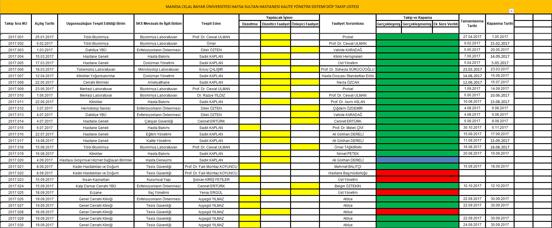 3. DÜZELTICI/ÖNLEYICI FAALIYETLERIN ETKINLIĞINI VE KONTROLÜNÜ SAĞLAMAK AMACI ILE SISTEM INTRANET ORTAMINDA KURGULANDI. OLUŞTURULAN PROGRAM SAYESINDE BILDIRIMLERIN NE ZAMAN VE KIM TARAFINDAN YAPILDIĞI BUNUN YANI SIRA NASIL BIR ÇÖZÜM YOLU BULUNDUĞU KAYIT ALTINA ALINMASI VE KALITE YÖNETIM BIRIMINDE MUHAFAZA EDILMESINE YÖNELIK DÜZENLEMELER YAPILDI. DÖF’LERIN KAPATILMA ORANLARI 3 AYLIK PERIYOTLARDA ANALIZ EDILMEKTEDIR. KALITE YÖNETIM BIRIMINE 2017 YILI IÇERISINDE 132 BILDIRIM YAPILMIŞ 53 TANESI ÇÖZÜME KAVUŞTURULARAK KALICI DÜZENLEMELER YAPILMIŞTIR.